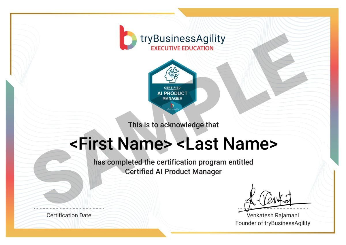 Upon successful completion of the program, participants receive the Certified AI Product Manager credential issued by tryBusinessAgility. This professional certification confirms your ability to lead AI-focused product development initiatives and demonstrates that you have mastered the frameworks, tools, and techniques taught throughout the course.